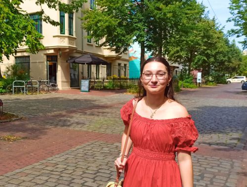 Eine junge Frau in einem roten Kleid auf der Goethestraße
