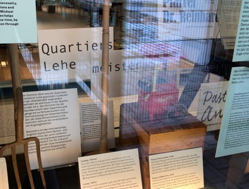 Verschiedene Infotexte der Ausstellung, sowie begleitende hinter einem Schaufenster